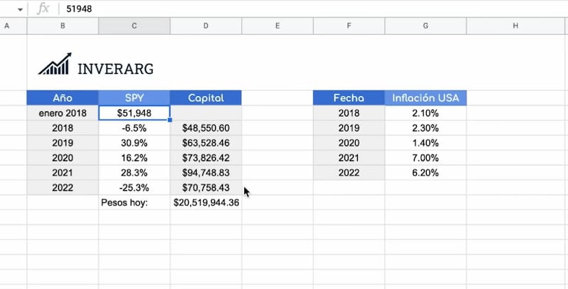 Siguiendo los cálculos, terminaríamos el año en $ 70.758,43, lo cuál, "al valor del dólar de $ 290 nos queda en un total de $ 20 millones", señaló Inverarg. Y agregó que con esta inversión, se le gana al ahorro en dólares y a hacer un plazo fijo en pesos con interés compuesto.