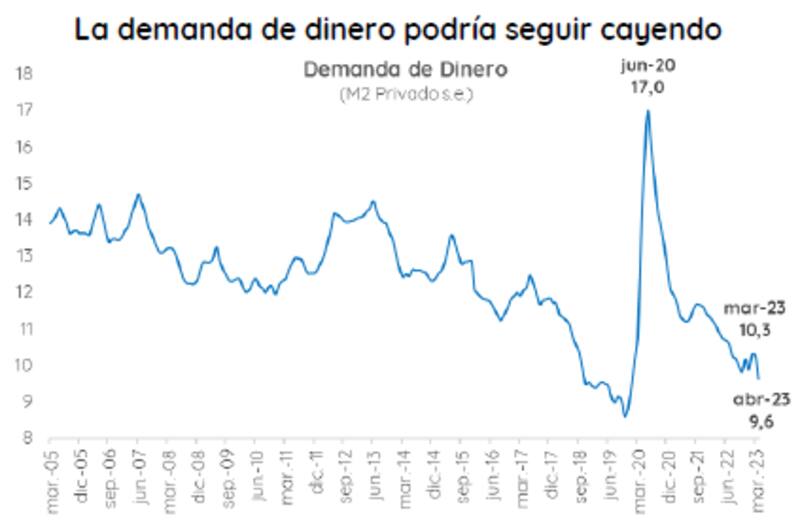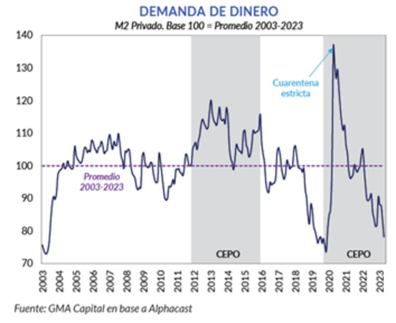 "La demanda de dinero claramente bajó otro escalón en las últimas jornadas. Para darle un golpe de gracia, probablemente necesite un efecto político como una renuncia de Massa seguido por la elección de un ministro visto como muy cercano a Cristina. O un enfrentamiento abierto con el FMI en donde la demanda de dinero baje otros dos o tres escalones. No se necesita una imaginación frondosa para pensar esto, pero no creemos que sea lo más probable", comentaron.
