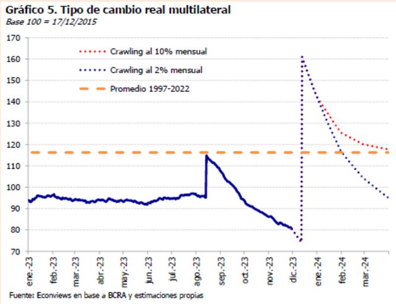 En esa línea, agregaron que seguir devaluando al 2% mensual implica que, en enero el tipo de cambio real se va a apreciar un 18,2%, en febrero un 11% y en marzo 8,5%.