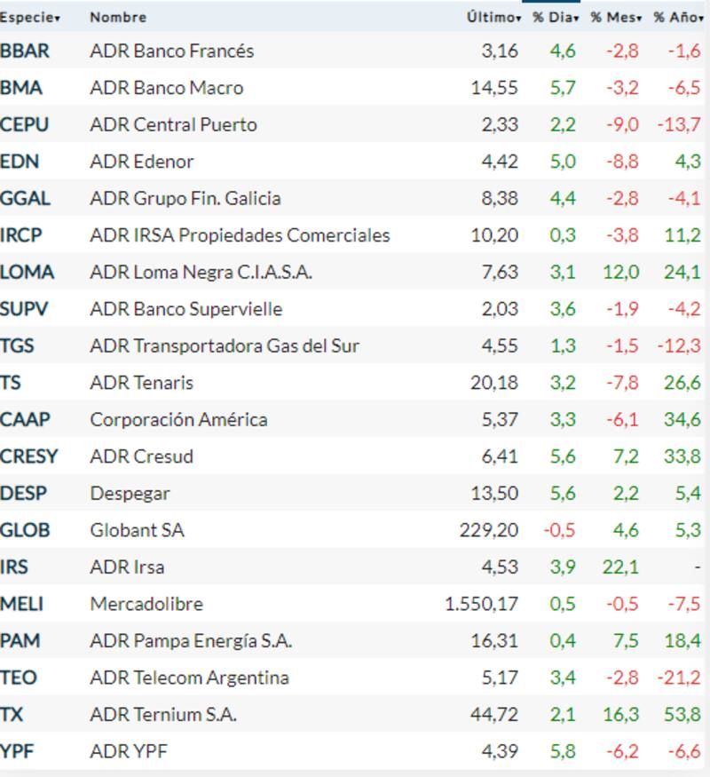 También los ADR se subieron a la euforia, con YPF liderando con un 5,8%, seguida por Banco Macro (5,7%), Despegar (5,6%) y Cresud (5,6 por ciento). La única empresa de propietarios argentinos que mostró una caída en Wall Street fue Globant (0,5 por ciento).