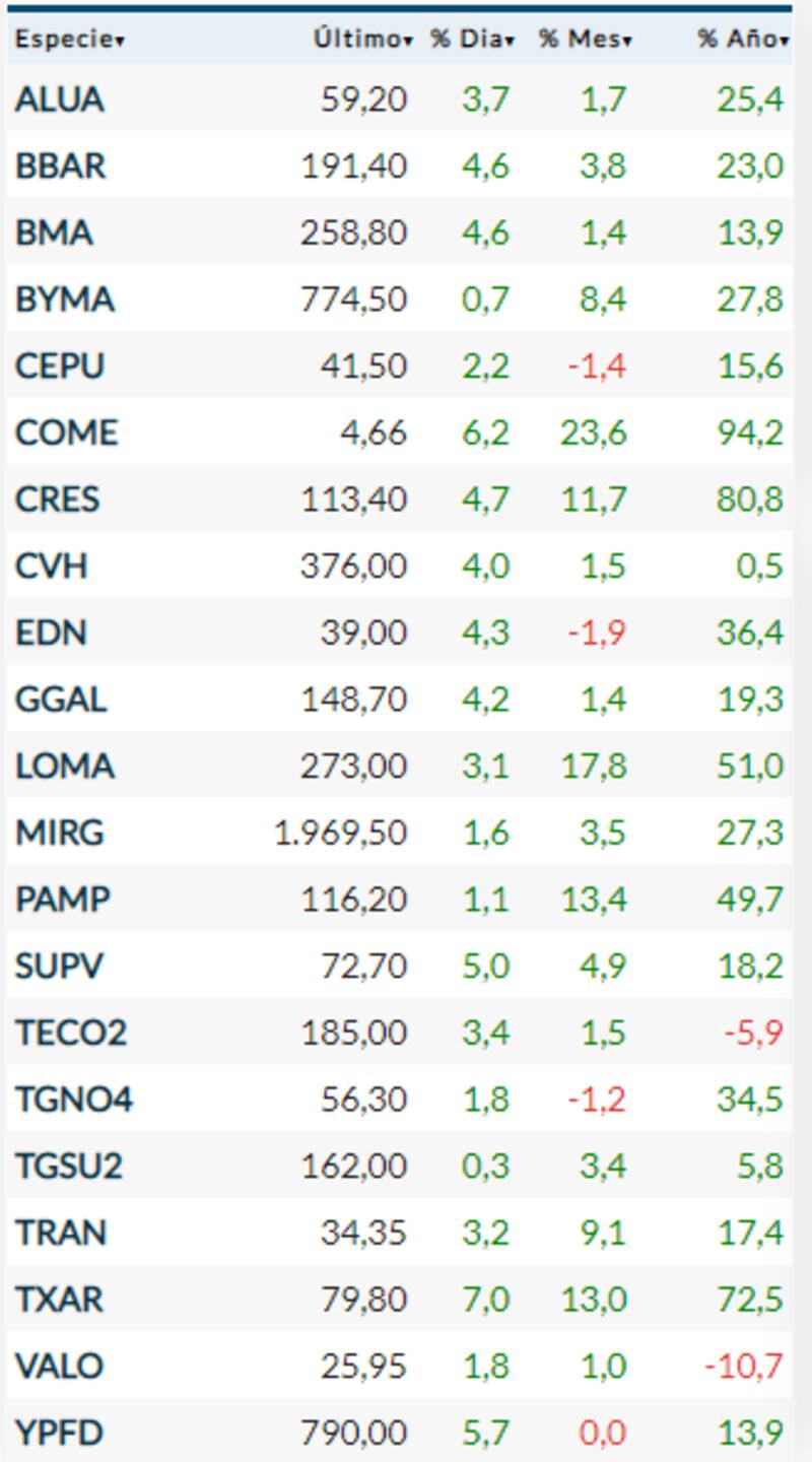 Entre las principales, los saltos más grandes los dieron Ternium (7%) y Comercial del Plata (6,2 por ciento). También se destacaron YPF (5,7%) y Cresud (4,7%). Entre los bancos, el alza principal la tuvo Supervielle (5%), seguida por Macro (4,6%), Francés (4,6%) y Galicia (4,2 por ciento).