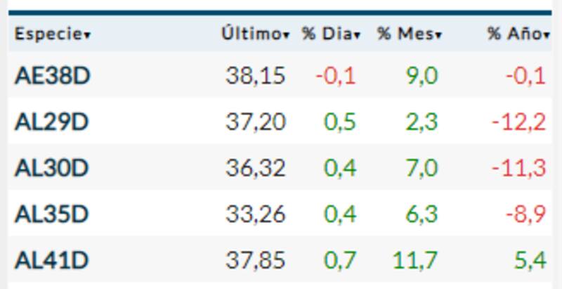 Una situación similar vivieron los bonos ley local, que subieron, pero con alzas acotadas. En la planilla de ByMA se destacó el avance de 0,7% del AL41D.