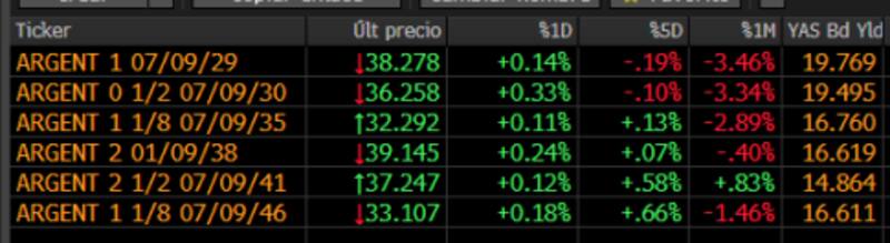 Los bonos soberanos de Argentina emitidos bajo ley neoyorquina tuvieron avances muy moderados, tan es así que la principal suba apenas alcanzó el 0,33%, en el caso del GD30. Este bono se colocó, de esta forma, en una Tasa Interna de Retorno (TIR) de 19,5 por ciento.