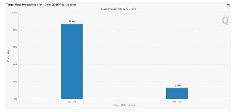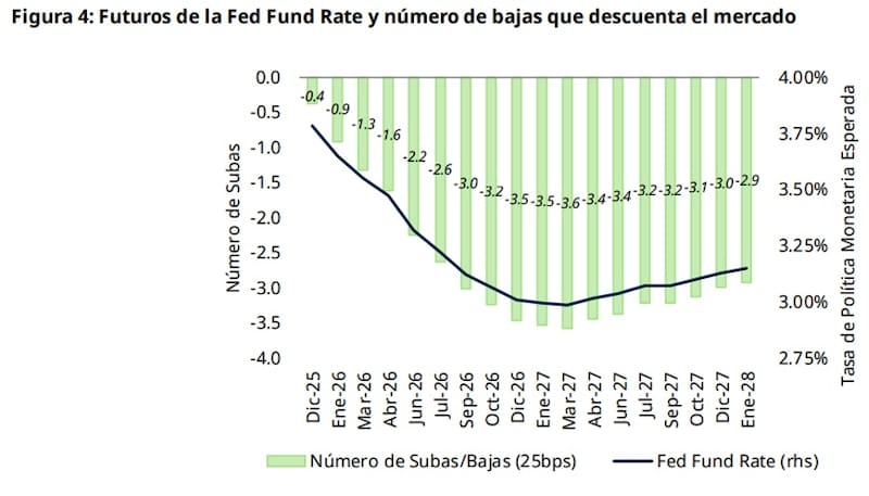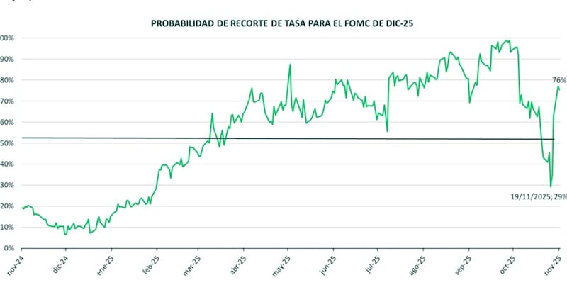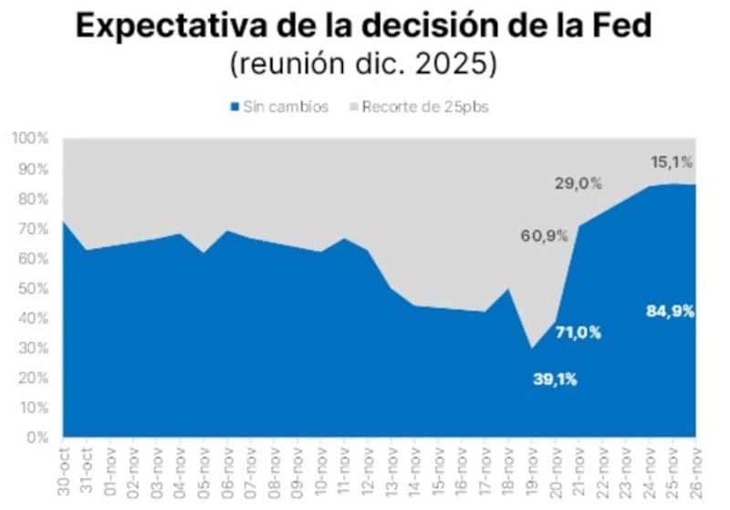 El mercado incorpora un 87% de recorte en diciembre, un 41% de probabilidad de recorte en abril y un tercer recorte en julio próximo.