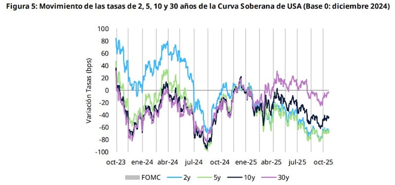 “La falta de datos económicos por el shutdown y la división interna entre los miembros del FOMC llevaron a mayores expectativas de una pausa en diciembre. Sin embargo, en las reuniones subsiguientes debería retomarse el sendero a la baja en caso de que la economía evolucione favorablemente”, indicó.