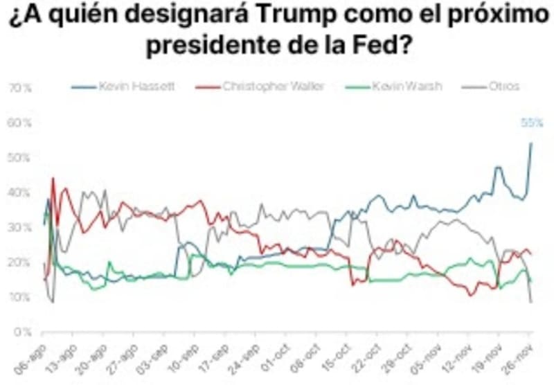 Según los trascendidos entre los medios, el mejor posicionado para ocupar el puesto de Powell es Kevin Hasset, hoy asesor de la Casa Blanca. Tambien se encuentra en carrera el gobernador Stephen Miran, quien mantiene su postura de avanzar con recortes más agresivos.