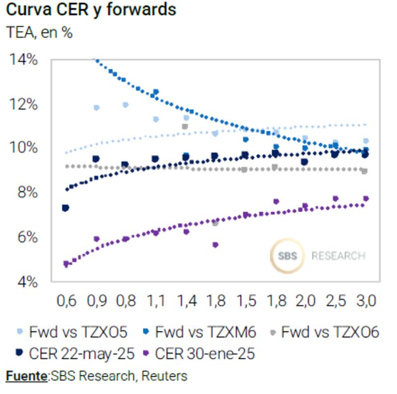 "La decisión de pararse en tal o cual tramo de la curva tasa fija en pesos, o de la curva CER, dependerá tanto del perfil del inversor como del view macro que se tenga. El sendero de inflación breakeven sigue mostrando niveles ambiciosos de desinflación de aquí hacia adelante. Si bien no descartamos que se materialicen, hacemos énfasis en que lucen desafiantes y en que, para lograrse, debería no existir ningún tipo de evento de tensión cambiaria que pudiera provocar tensión nominal", explicó.