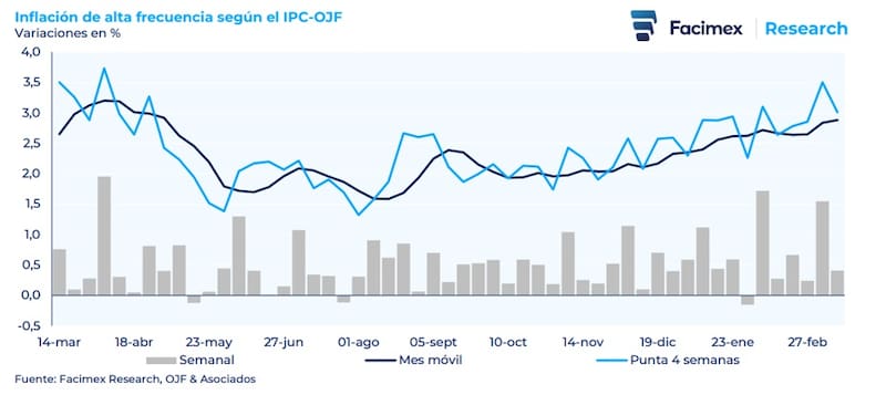 “De cara al dato de inflación de marzo, el arrastre estadístico del IPC-OJF quedó en 2,5% mensual y, al asumir una inflación del 0,4% semanal en las próximas semanas, el mes cerraría en 2,9% mensual. Nuestro escenario base descuenta que marzo mostrará el pico inflacionario del año”, sostuvo Yarde Buller.