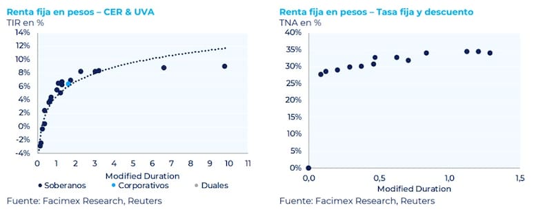 Por su parte, los bonos que ajustan por CER operan con tasas reales de 4% a 6% en el tramo corto de la curva y en niveles de 8% en el tramo medio y largo de la curva.