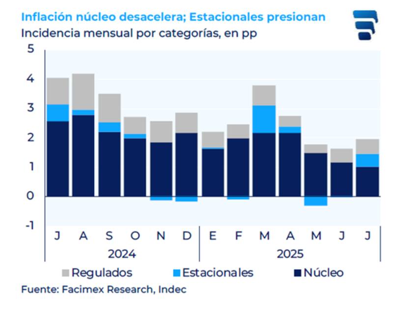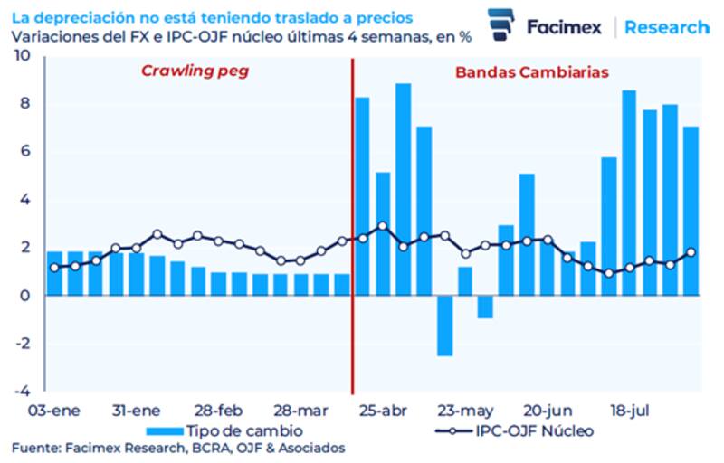 Para el trimestre móvil anualizado, las marcas se ubicaron en 22,0% y 23,8%, respectivamente. "Estos son los menores registros desde noviembre de 2017 y febrero de 2018. La aceleración de julio fue apuntalada por regulados y estacionales en un mes en que la variación del dólar fue de 14% (y de 20% si partimos de los mínimos de la semana corta de junio), por lo que el pass-though del mes fue bajo, sobre todo mirando la inflación núcleo", dijo.