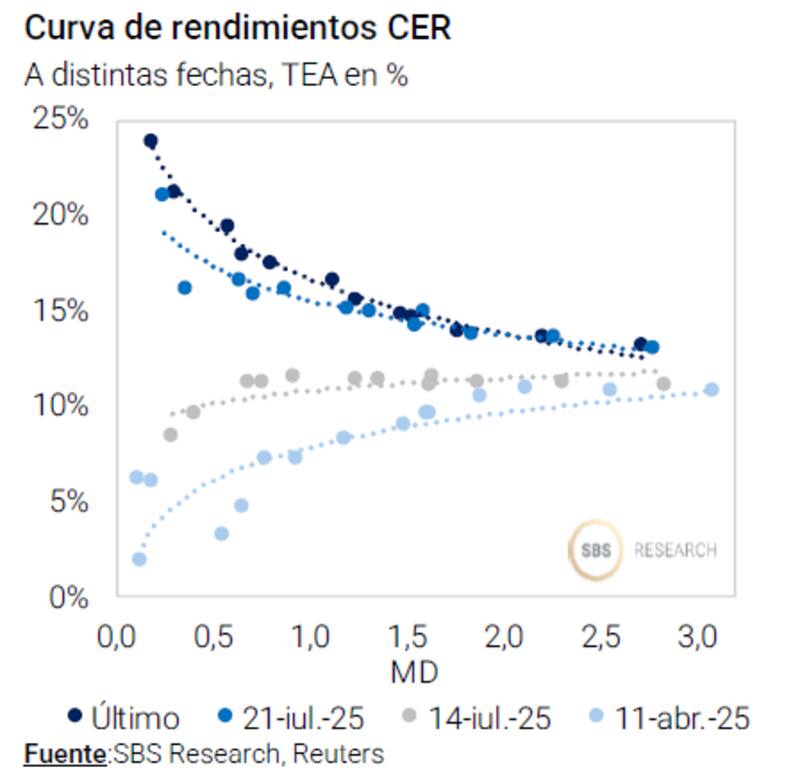 "La semana pasada las tasas reales del tramo corto CER volvieron a alcanzar máximos de los últimos años y cerraron entre 22% a 25%, mientras en el tramo medio operan con tasas del 15% a 20% y largo en rendimientos de 13% a 14%, por lo que también siguen siendo muy elevadas", resaltaron.