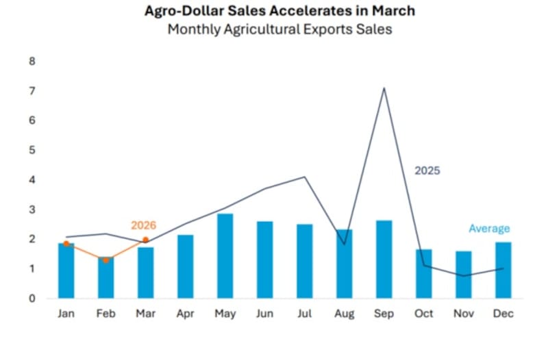 De ese total, unos u$s 31.700 millones corresponden solamente a soja y maíz, cuyos precios subieron en promedio 4,3% y 5,0% en marzo frente a febrero.