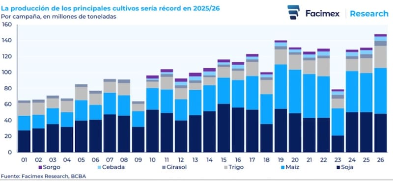 Las estimaciones de la Bolsa de Cereales de Buenos Aires apuntan a que, entre el sorgo, la cebada, el girasol, el trigo, el maíz y la soja, la campaña de 2025 y 2026 alcance los 150 millones de toneladas.