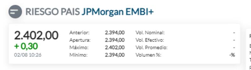 En medio de la espera, el riesgo país vuelve a ubicarse por encima de los 2400 puntos. El indicador que mide JP Morgan se sitúa en 2402 puntos básicos, avanzando 122% desde el canje de deuda llevado a cabo por el Gobierno en septiembre de 2020.