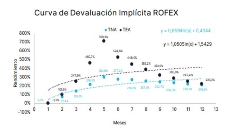 "Parte del mercado no cree que Sergio Massa logre mantener el tipo de cambio oficial en $350 hasta las elecciones. Esto se ve reflejado en los contratos de ROFEX con vencimientos en septiembre hacia adelante, a través de los cuales se ven tasas implícitas de devaluación para octubre de un 24% y 55% en noviembre de forma directa", comentó Merea Vega.