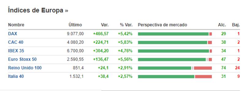 Así, en Frankfort el DAX subía más del 5,58%; en Londres, el FTSE -100 avanzaba hasta 3,16%; en Paris, el CAC40 trepaba a 5,75%, mientras que en Madrid, el Ibex ganaba 5,48%.