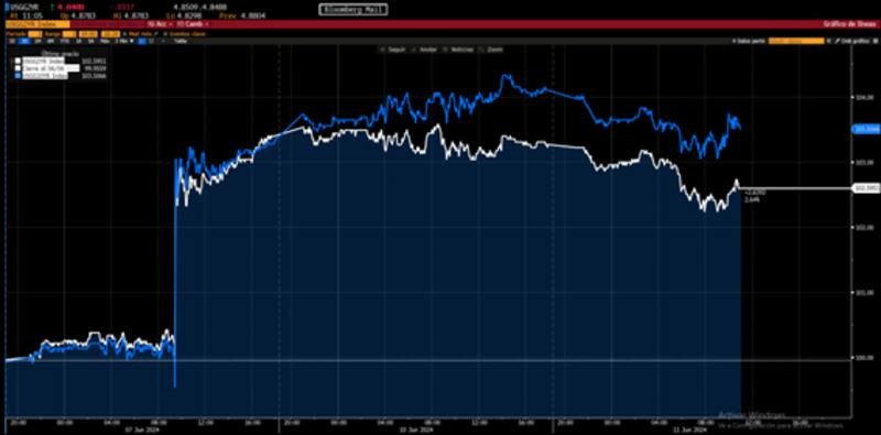 Adicionalmente, si sube la tasa de los bonos de EEUU, implica que el precio de dichos bonos está cayendo (la tasa se mueve inversamente al precio).