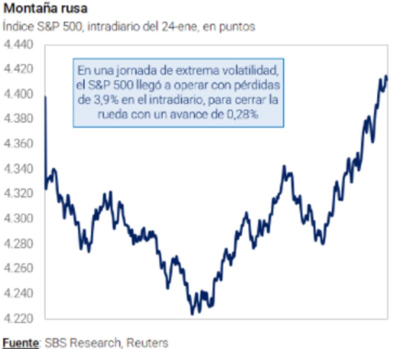 Desde Grupo SBS señalaron que tanto los potenciales conflictos bélicos entre Rusia y Ucrania como el inminente statement del FOMC de la Fed del miércoles (donde no se espera que suban tasas) dieron lugar a jornadas sumamente volátil en los mercados globales.