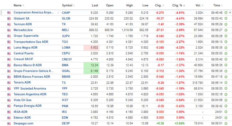 En cuanto a las acciones, la mayoría de los ADR opera en baja. Corporación América retrocede 4,9%, seguido por Globant, Ternium y MercadoLibre que can entre 2,7% y 4,4%