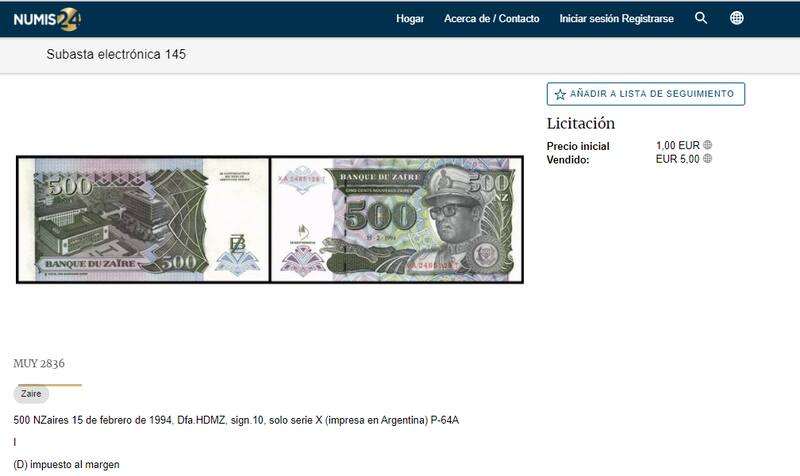 La casa de subastas austríaca Numis 24 remató en 5 euros el billete de 500 Nouveaux Zaires, impreso en Argentina, lo que significó la venta de cinco veces su valor de base, publicado en noviembre pasado.