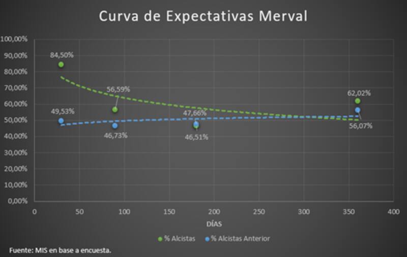 Para el plazo de 60 días, la cantidad de alcistas también subió aunque en menor manera desde 46,73% de la encuesta pasada a los 56,59% actuales. Respecto de la visión de los participantes de 180 días, los alcistas no mostraron grandes cambios ubicándose en 47,66% desde los 46,51% previos. Para el plazo de 180 días tampoco se evidencian grandes cambios.