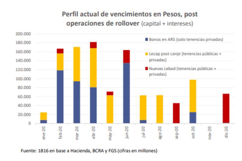 Los analistas de la consultora 1816 afirmaron que, si bien hasta el momento la estrategia de Economía ha sido exitosa en el tratamiento de la curva doméstica, hay que tener presente que el perfil de vencimientos en moneda local sigue siendo muy concentrado en 2020.