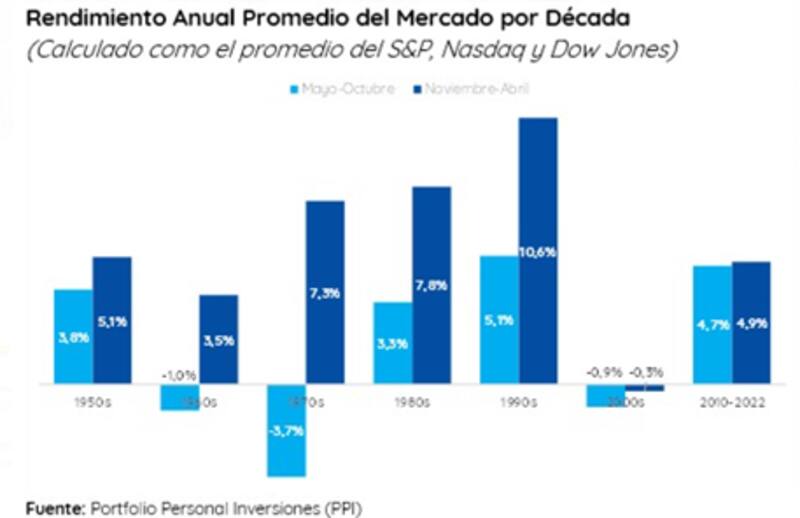"El rendimiento promedio del S&P, el Nasdaq y el Dow Jones entre abril y octubre fue de 1,8%, 3% y 0,8% respectivamente, mientras que entre noviembre y marzo la media fue de 5,1%, 6,6% y 5,5%. La diferencia es notable. Sumado a esto, las peores caídas se sufrieron entre mayo y octubre, mientras que las mayores ganancias fueron entre noviembre y abril", detalló.