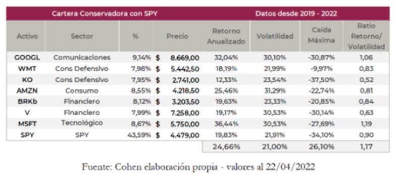 "En la búsqueda por disminuir la fluctuaciones de precios, se obtuvo esta cartera que logró un promedio de 21% de volatilidad para los últimos tres años versus el SPY, cuyo promedio es 21,9%. Su composición diversificada logra disminuir el riesgo no sistemático, al tiempo que toma una estrategia más defensiva para sufrir en menor medida la suba de tasas de los próximos meses", dijo.