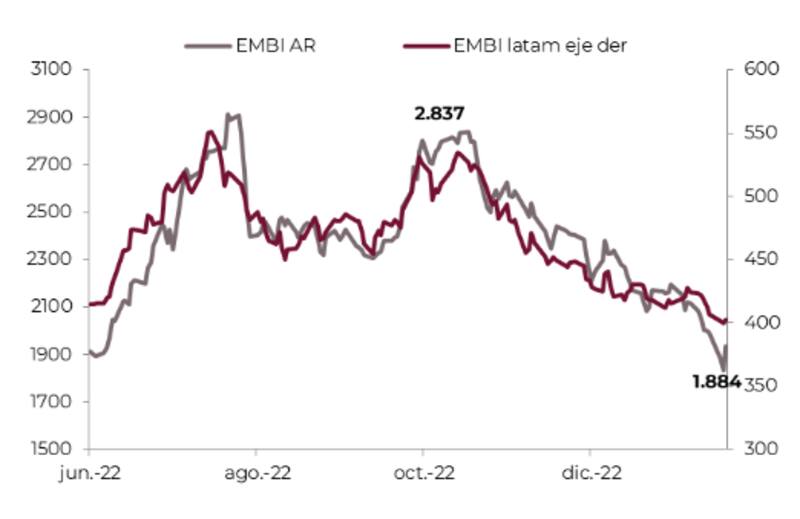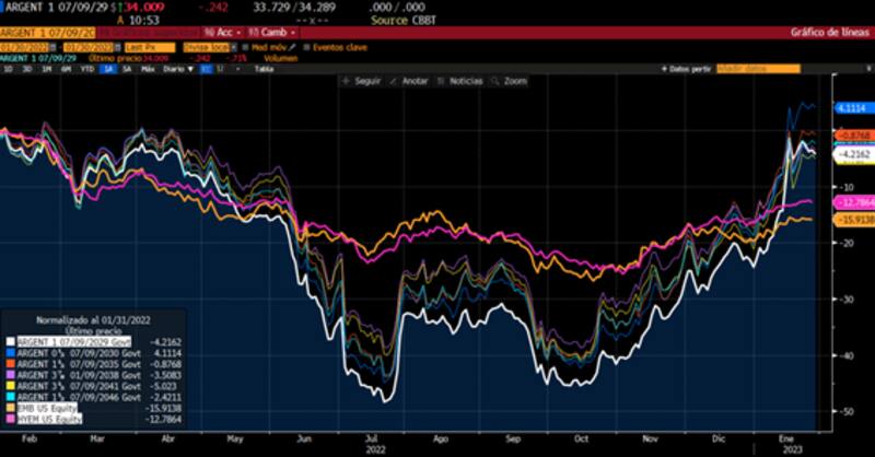"El riesgo emergente cayó 20%, el Tipo de Cambio Real Multilateral recuperó 10%, mientras que los precios de las materias primas se estabilizaron en niveles altos. Desde los mínimos de mediados de octubre del año pasado, las paridades de los bonos marcaron subas de +50 / 65% registradas en dólares. Esto no hizo más que devolvernos a las paridades que dichos bonos tenían a comienzos de 2022", comentaron.