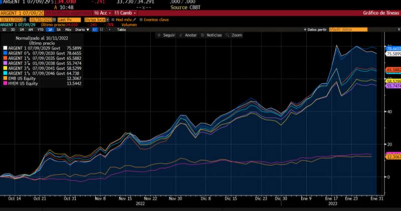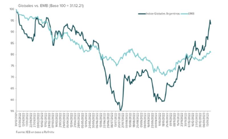 Los analistas de Grupo IEB señalaron que el rally de los bonos argentinos que se viene produciendo desde octubre del 2022 es explicado en gran parte por el contexto más constructivo para la deuda emergente.