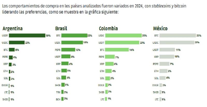 En segundo lugar, se ubicó bitcoin, con el 8% de las compras, frente al 22% de la región. Luego, se situaron la memecoin Pepe (con 4% del total), XRP (3%), Ether (2%) y Solana (2%). En América latina, XRP (9%) y Pepe (6%) ocuparon el tercer y cuarto puesto, detrás de las stablecoins (39%) y bitcoin (22%).