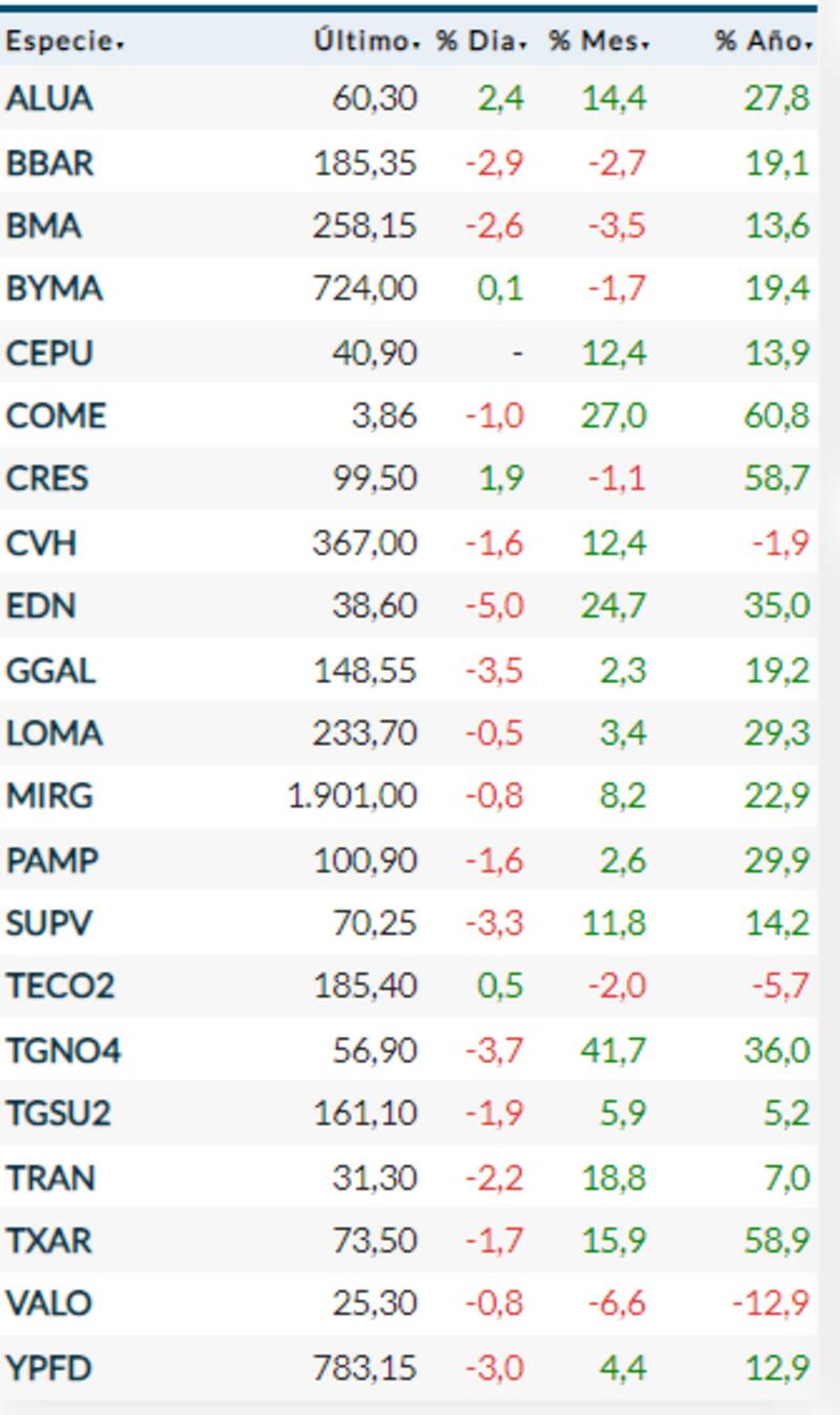 En tanto, Grupo Financiero Galicia cede 3,9%; Supervielle, 3,6% y Banco Francés 3,5 por ciento. Entre los pocos avances se destacaron Central Puerto (2%) y Ternium (1,8 por ciento).