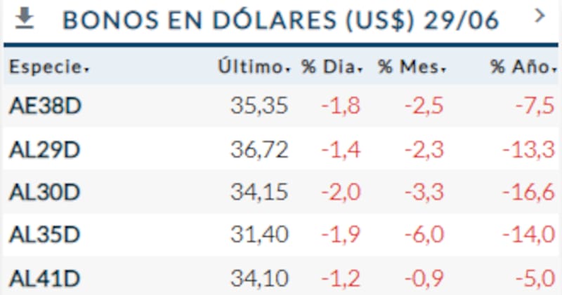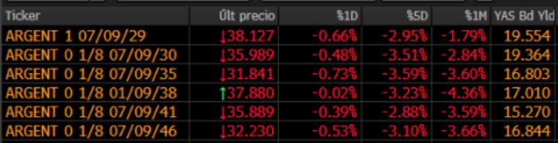 Entre los bonos casi todas son malas: la curva de legislación extranjera mostró caídas que, si bien son inferiores al 1%, continúan una tendencia muy negativa. El GD30 baja 0,48% y ya muestra una TIR de 19,4 por ciento.