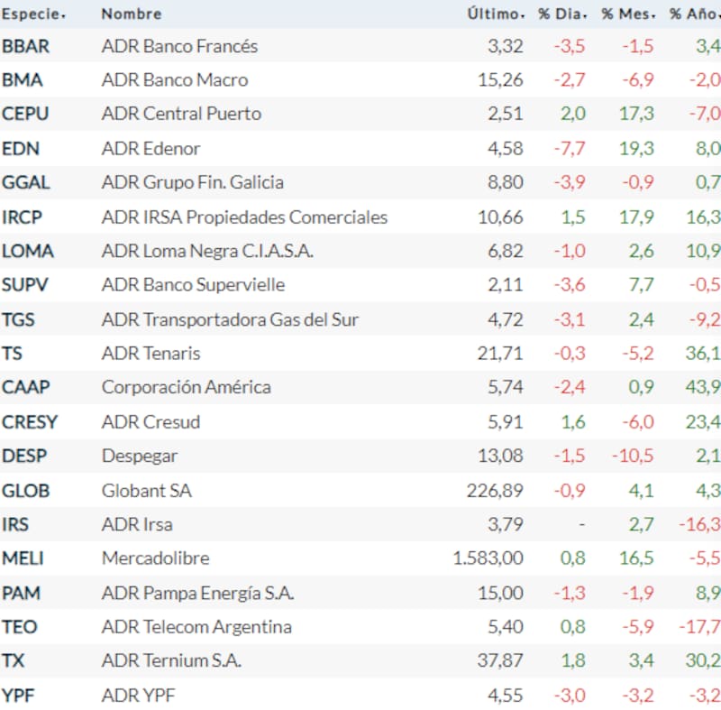 En cuanto a los ADR argentinos en New York, también la pizarra estuvo dominada por el color rojo y a principal caída del día fue la de Edenor (7,7 por ciento).