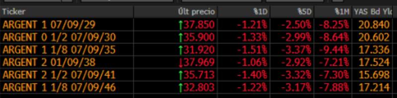 Con esta caída, la parte corta de la curva de bonos emitidos bajo ley Nueva York opera con tasas por encima del 20,8% y la parte más larga rinde por encima del 16% en promedio.