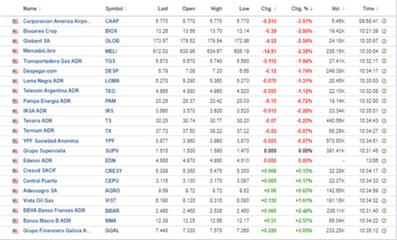 Las acciones de Corporación América pierden 3,5%, seguido por Bioceres y Globant que caen 2,8% y 2,4% respectivamente,.
