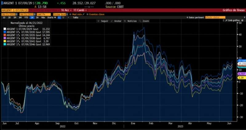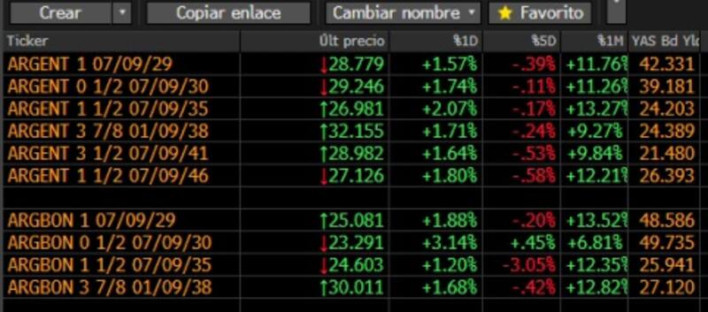 En lo que respecta a la deuda de ley local, los bonos ganan desde 1,7% como el AL38 y hasta 3,1% como el AL30, mientras que en el último mes también se ven avances de entre 6,8% y hasta 13,5%.