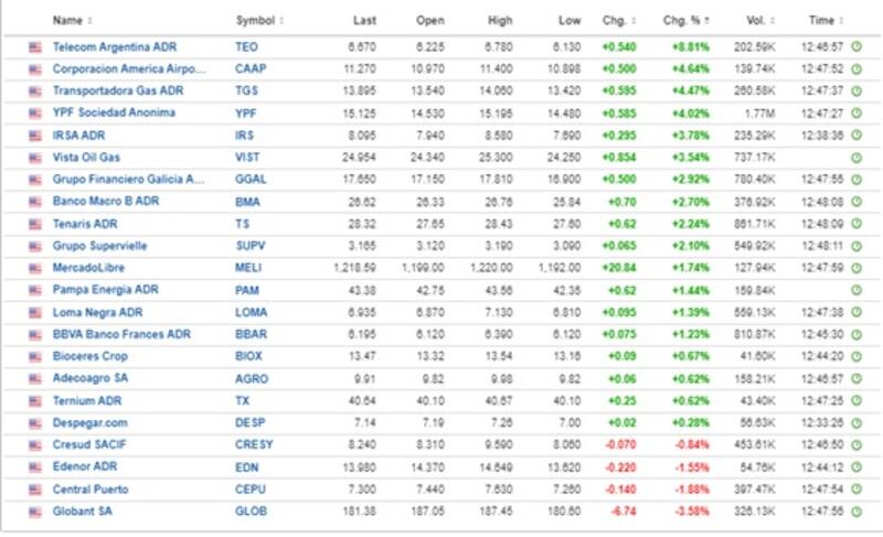 Las ganancias de los ADR en el día de hoy son lideradas por Telecom, que avanza 8,8%, seguida por Corporación América, que gana 4,64% y TGS e YPF con avances de 4,4% y 4% respectivamente.