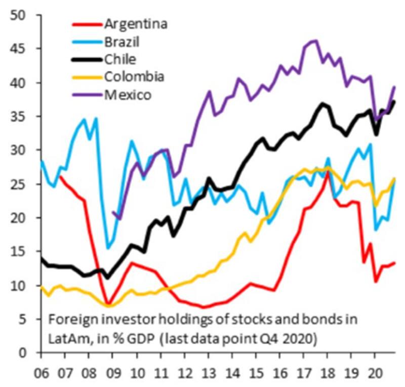 Todos los países de la región tuvieron su pico de participación de los inversores internacionales en 2018. Pero salvo la Argentina y México, el resto de las naciones latinoamericanas muestran un movimiento más gradual de la posición de inversores internacionales en sus activos.