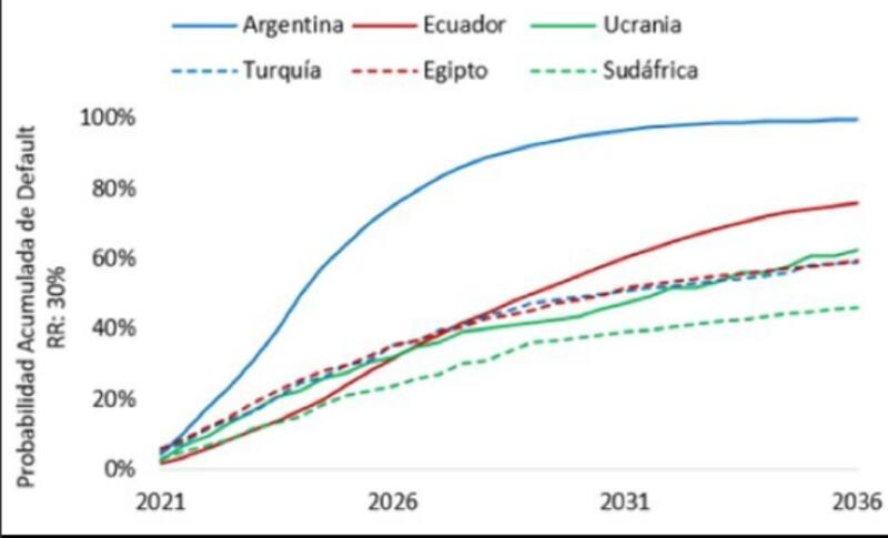 La probabilidad de default acumulada es del 75% a 2024 y pega un salto a 2026 para ubicarse en torno al 85% y 95% de cara a los próximos 10 años.
