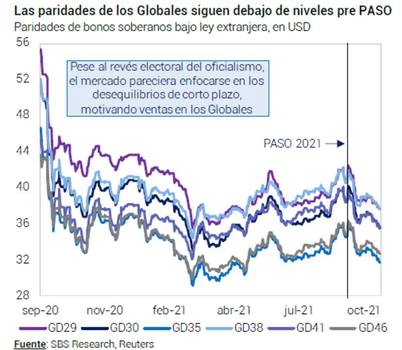 El colapso de las paridades fue en línea con el fuerte selloff de los bonos. Desde el pico post PASO, las paridades se ubicaban en torno a u$s 40 en promedio, con picos de u$s 43 y retrocedieron a u$s 35 actualmente, con mínimos de u$s 33 como el Global 2046 y el Global 2038.
