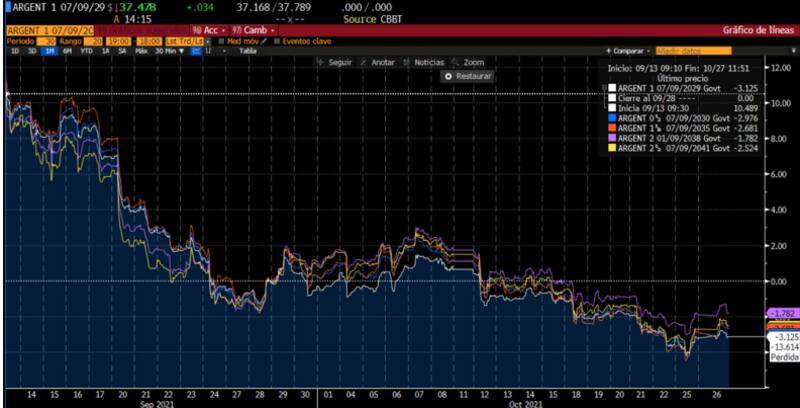Desde el pico del lunes posterior a las PASO, la deuda argentina no paró de caer. Desde entonces y hasta la actualidad, los bonos soberanos en dólares acumulan una caída del 13%, fueron quebrando mínimos en forma constante y anotaron tan solo unas pocas ruedas de subas.