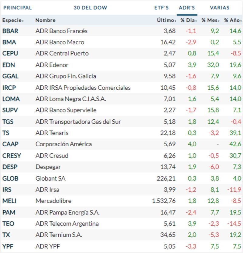 Los ADR argentinos también estuvieron repartidos, aunque predominaron las subas. Los mejores avances fueron los de Corporación América (4%), Edenor (3,9%) y Telecom (3,9%).