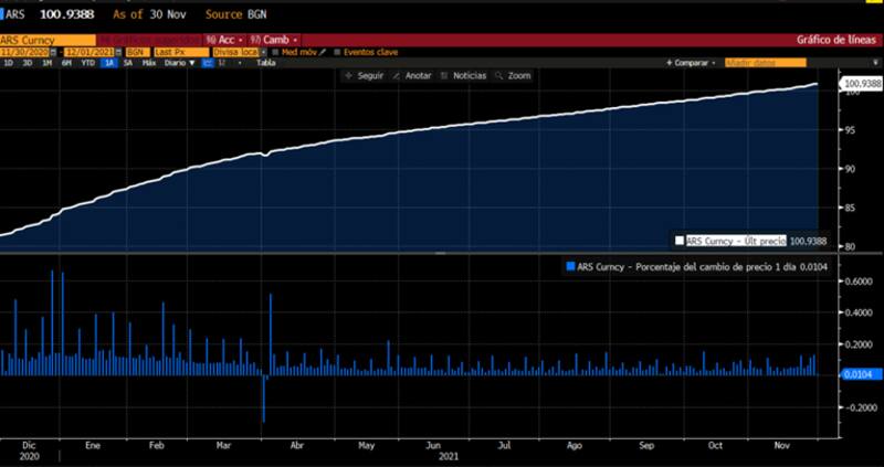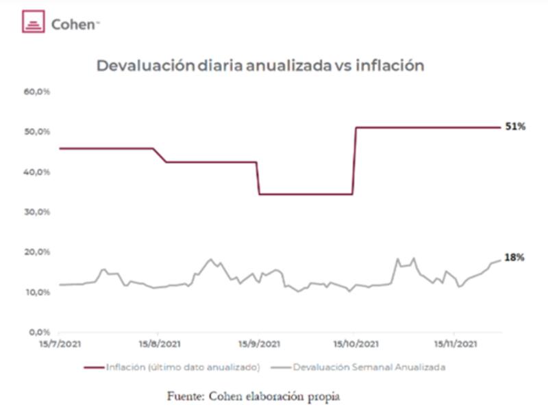 El hecho de que el Central no haya convalidado hasta ahora un salto mayor del tipo de cambio no significa que no haya acelerado levemente el ritmo de crawling peg. Los analistas de Cohen remarcaron que, en las últimas ruedas se vislumbró un leve aumento del ritmo devaluatorio, subiendo del 13% en la semana del 15 al 21 de noviembre al 18% la semana pasada, lo que representa una suba de cinco centavos por día.