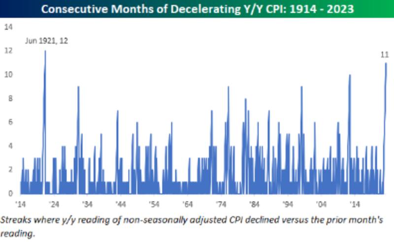 De hecho, según la consultora Bespoke, la inflación lleva un largo proceso de desaceleración y estamos en presencia de la racha más larga de desaceleración en el IPC interanual desde 1921, al acumular 11 meses seguidos de caída de la inflación interanual.