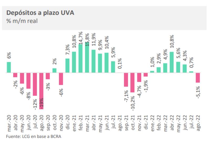 Según analizaron, al interior de los plazos fijos se observó un cambio en la dinámica que se deriva de lo expuesto, al haberse observado una contracción del 5,1% m/m real en los ajustables UVA, siendo la primera caída en lo que va del año.