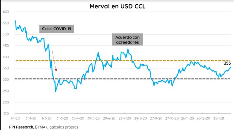 Con el índice Merval en USD en los 355 puntos,