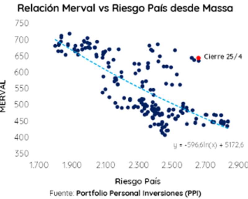 Sin embargo, destacan que desde la llegada de Massa, si bien la relación se mantiene en líneas generales (mayor riesgo equivale a menores valores del Merval), se observa un nuevo nivel en el cual opera.