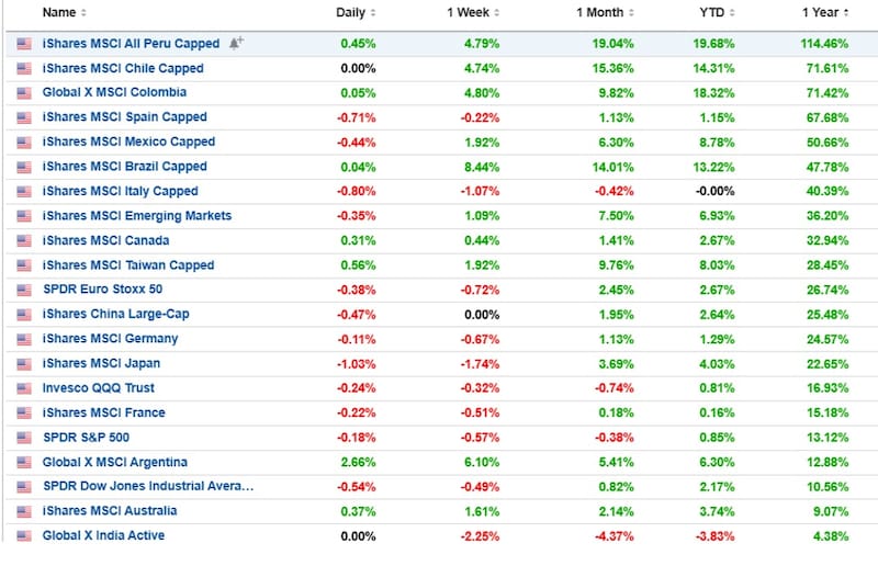 En el ultimo año, la bolsa de Perú y Chile ganan 114% y 71%, al igual que Colombia que avanza 71%. Mas abajo se encuentran las bolsas de España, México, Brasil, Italia, que ganaron entre 40% y 68%.