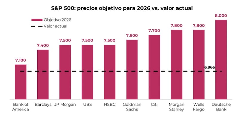 Un poco mas optimistas se encuentran los bancos de inversión Barclays, JP Morgan, UBS y HSBC, que anticipan un fin de 2026 para el S&P500 de entre 7400 y 7500 puntos, es decir, una ganancia de 8% desde los valores actuales.